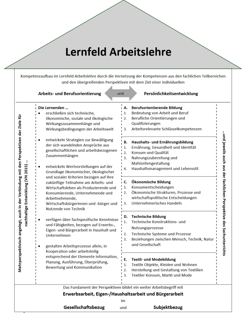 Das Lernfeld Arbeitslehre trägt zu einer ganzheitlichen Bildung bei, indem theoretisch-reflexives und praktisch-handelndes Lernen aufeinander bezogen werden. Die Lernenden erwerben Kompetenzen, die es ihnen ermöglichen, aktiv und bewusst an der kritisch-konstruktiven Gestaltung der Arbeits- und Lebenswelt (Erwerbsarbeit, Eigen- bzw. Haushaltsarbeit und Bürgerarbeit) teilzuhaben und ein berufliches Selbstkonzept zu entwickeln. Sie streben in diesem Lernfeld in Kooperation mit anderen Unterrichtsfächern ein berufliches Selbstkonzept an, welches sie befähigt, sowohl in Bezug auf den gesellschaftlichen als auch den wirtschaftlichen Wandel reflektiert und flexibel zu agieren (vgl. Gmelch 2018/1989; Dedering 2004; Beinke 2005; Fischer/Pfriem 2011, 330; Friese 2018, 27 ff.).